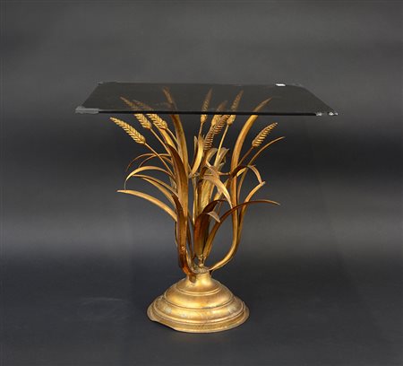 Tavolino da salotto con sostegno in metallo dorato a cespo di spighe con...