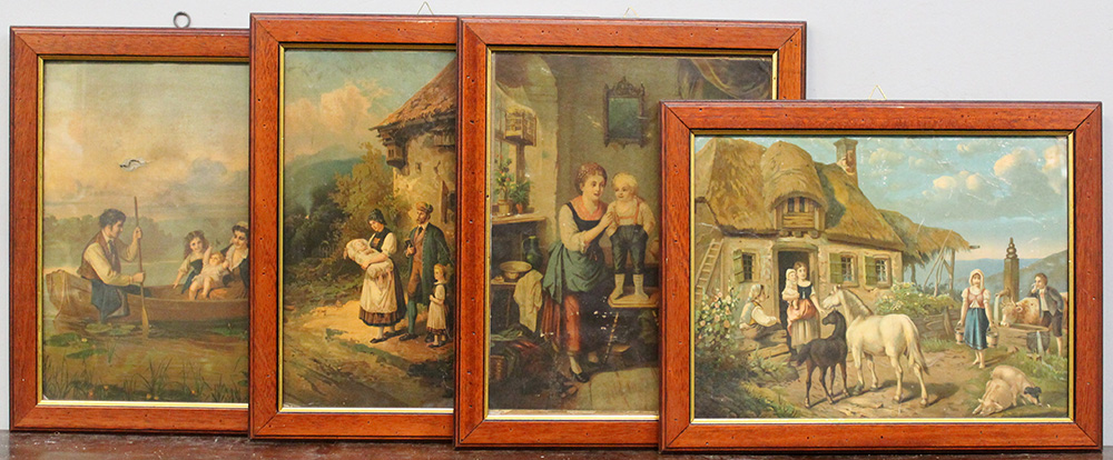 Lotto di ventiquattro cornici in noce, misure diverse, contenenti oleografie (difetti)