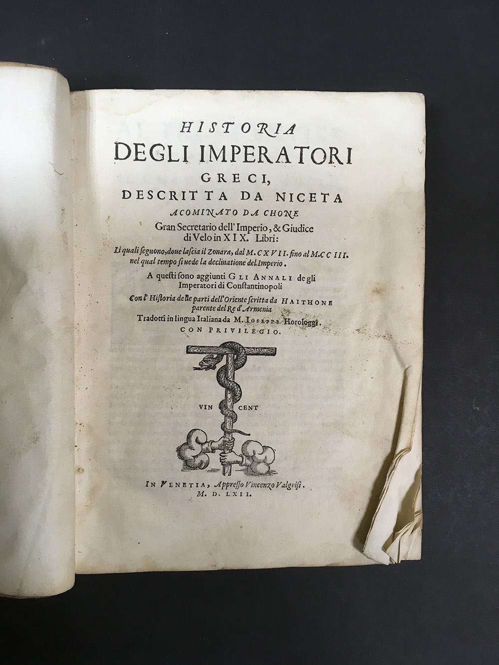 NICETAS, Acominatus. La historia de gli imperatori greci. Tradotti in Lingua Italiana da M. Ioseppe Horologgi. Venezia: 1562. Pergamena floscia coeva (difetti)