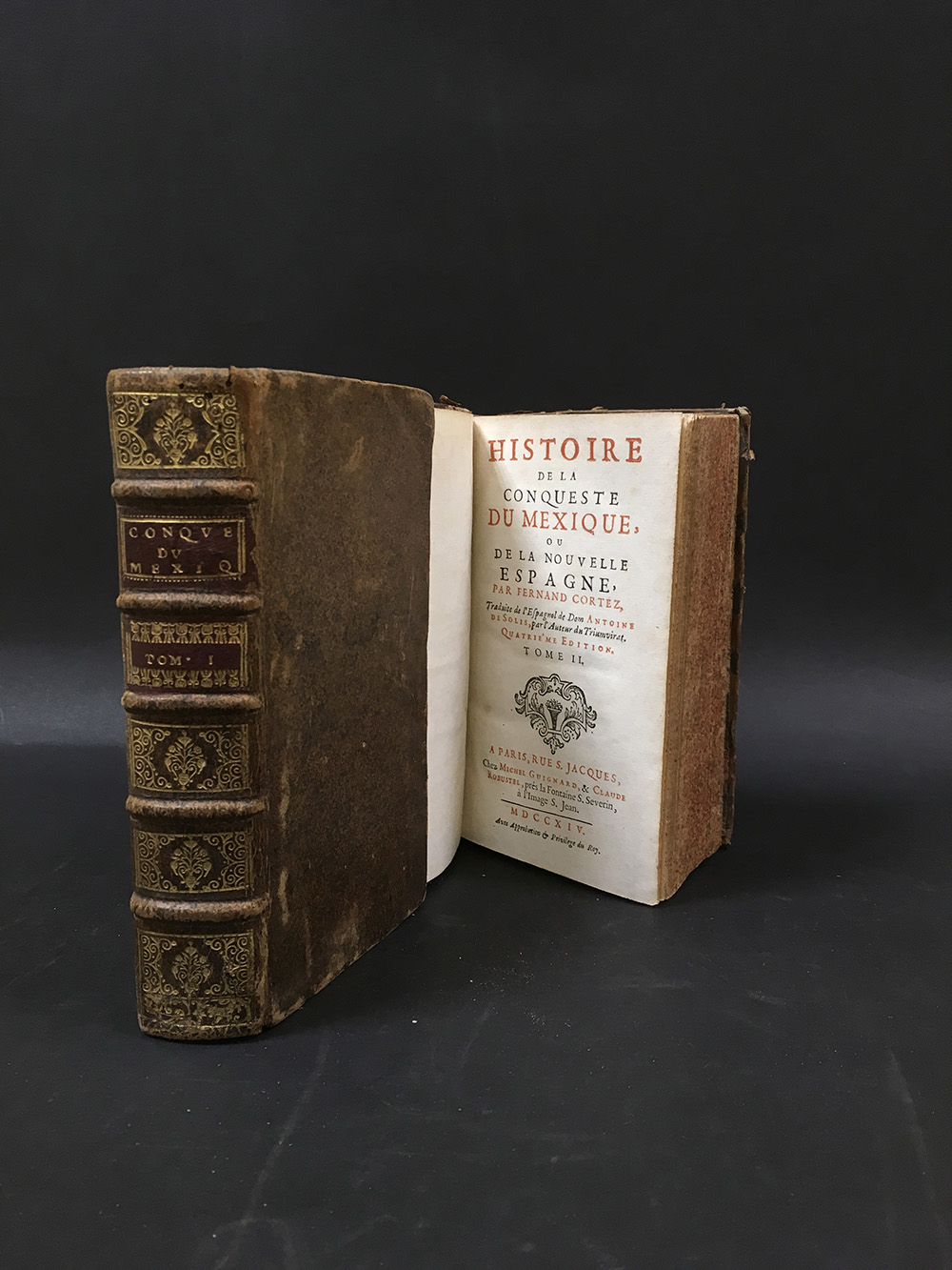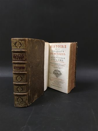 SOLIS, Antonio de. Histoire de la conqueste du Mexique, ou de la Nouvelle Espagne, par Fernand Cortez. Parigi: 1714. 2 volumi, 12mo. Titoli in rosso e nero, due mappe incise in rame e ripiegate e numerose tavole. Pelle coeva, tagli a spruzzo. Ottima copia