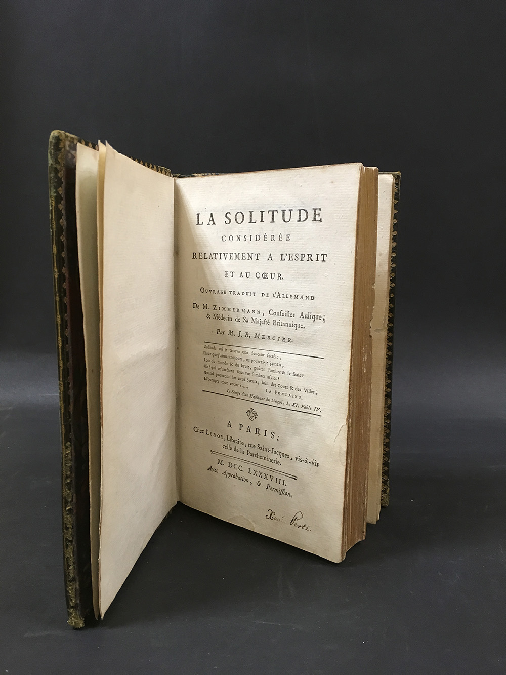 ZIMMERMANN, J. G. La Solitude Consideree Relativement A L'esprit et Au Coeur. Parigi, Leroy, 1788. 8vo,, firma di possesso dei Da Porto al frontespizio, Legatura coeva in marocchino verde, decori in oro al dorso, ai piatti e alle sguardie, titolo su tassello. tagli dorati (difetti)