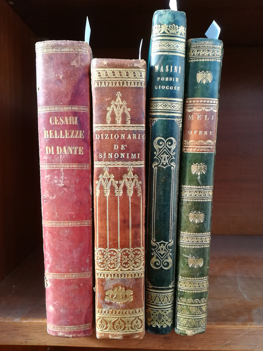 Lotto contenente una serie di volumi del XIX secolo fra cui un Dizionario dei Sinonimi (1830), Poesie Giocose di Masini, prima edizione Bolognese, Opere di Giovanni Meli (1838)