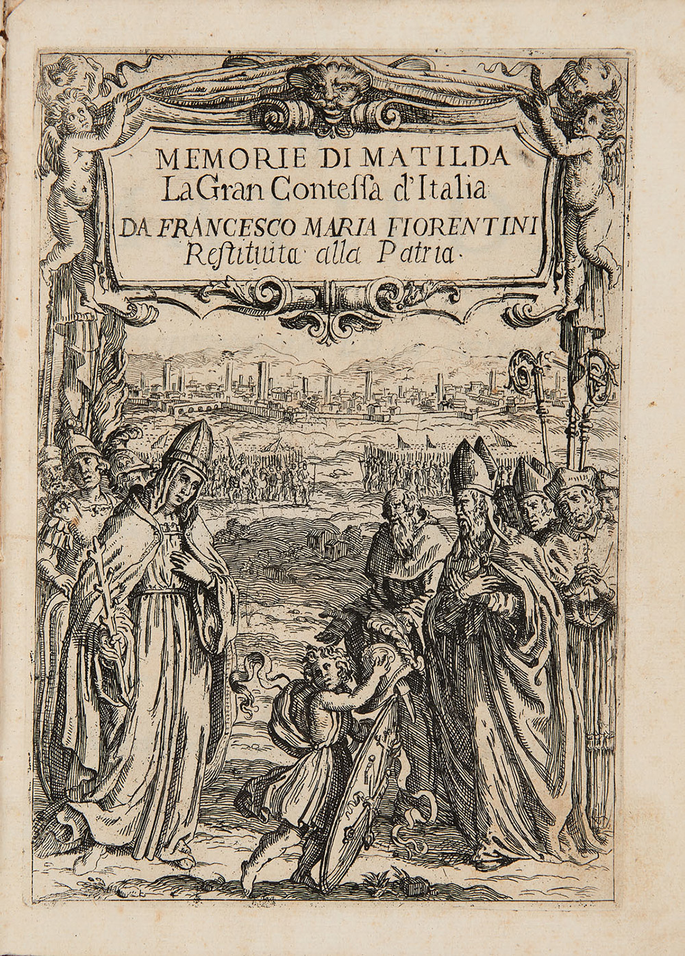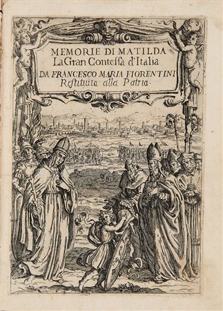 FIORENTINI, Francesco Maria (1603-1673) - Memorie di Matilda la gran contessa. Lucca: Pellgrino Bidelli, 1642. 4to (206 x 150mm). Bell'antiporta incisa in rame, frontespizio entro cornice xilografica, inziali incise in legno (alcuni fogli che si stanno staccando e altri che mancano). Legatura in pelle posteriore (manca il dorso, difetti)
