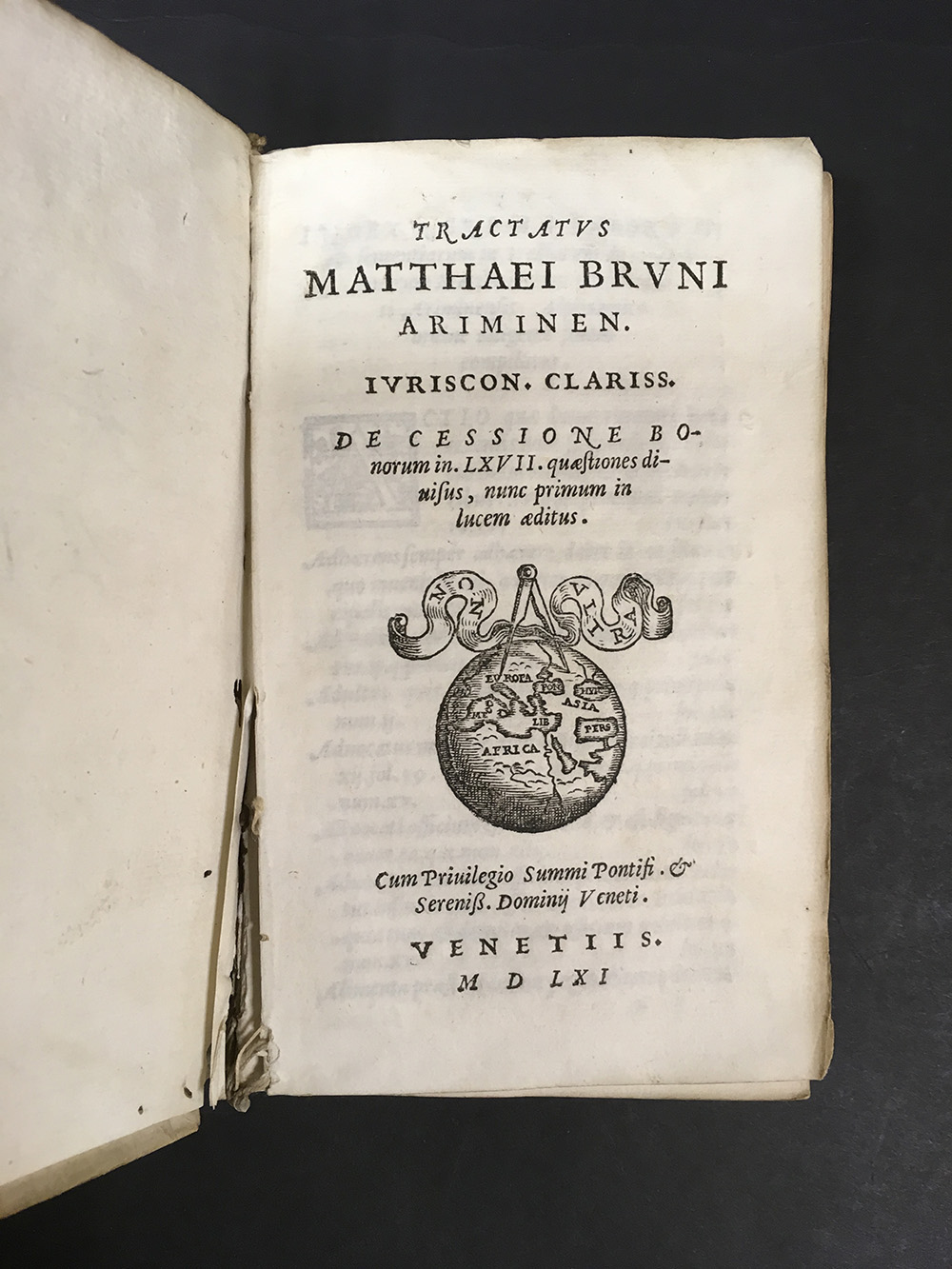 BRUNI Matteo. De Cessione bonorum. Venezia, Aurelium Pintium, 1561. 8vo, legatura coeva in pergamena floscia e titolo manoscritto al dorso