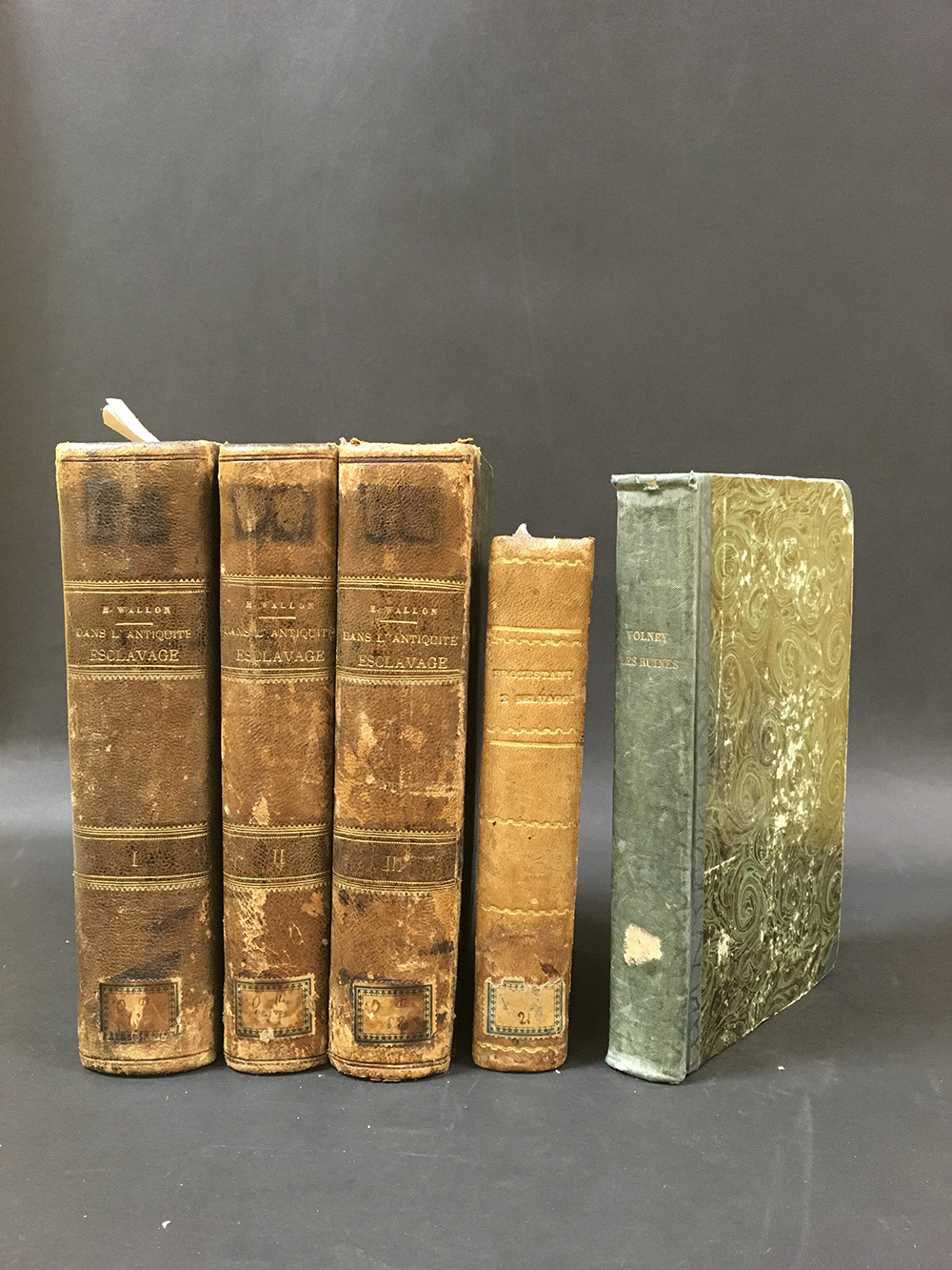 WALLON, Henri. De l’esclavage dans les colonies pour servir d’introduction a l’histoire de l’esclavage dans l’antiquité. Parigi: Dezobry, Magdeleine et C. 1847 [Legato con:] Histoire de l’esclavage dans l’antiquité. Parigi: Imprimerie Royale 1847. 3 volumi in 8vo. Nello stesso lotto altre opere