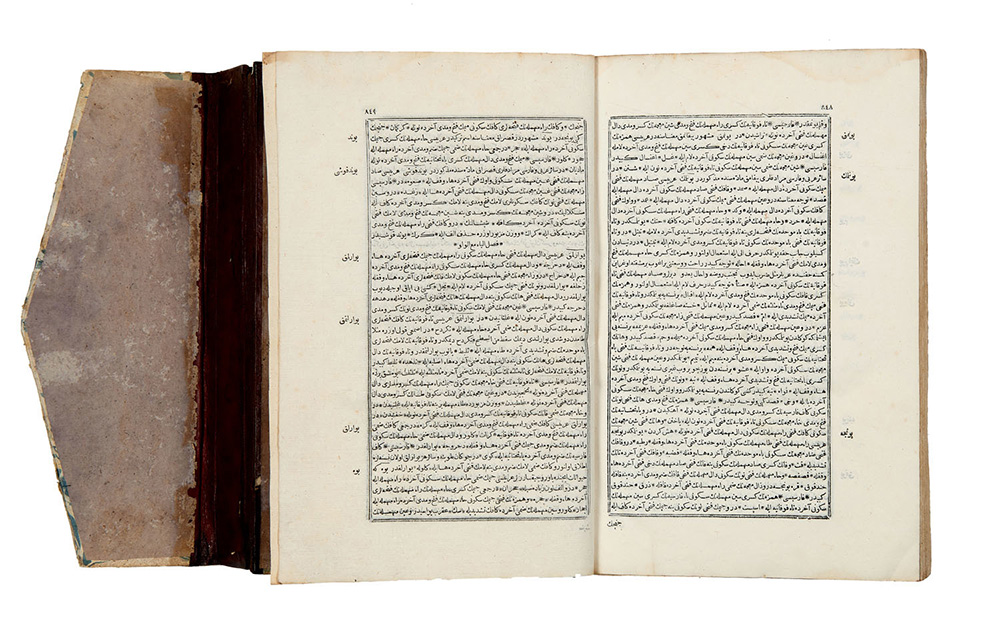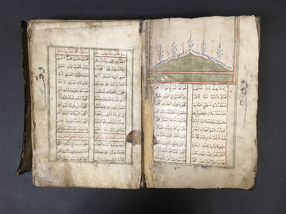 Manoscritto in arabo a tema religioso di area ottomana recante la data 1592 (1001). Titolo e dedica entro cornice decorata con tracce di foglia oro, testo su due colonne entro bordo decorativo rosso. Legatura coeva in pieno cuoio all'orientale con piatti decorati (difetti e mancanze)