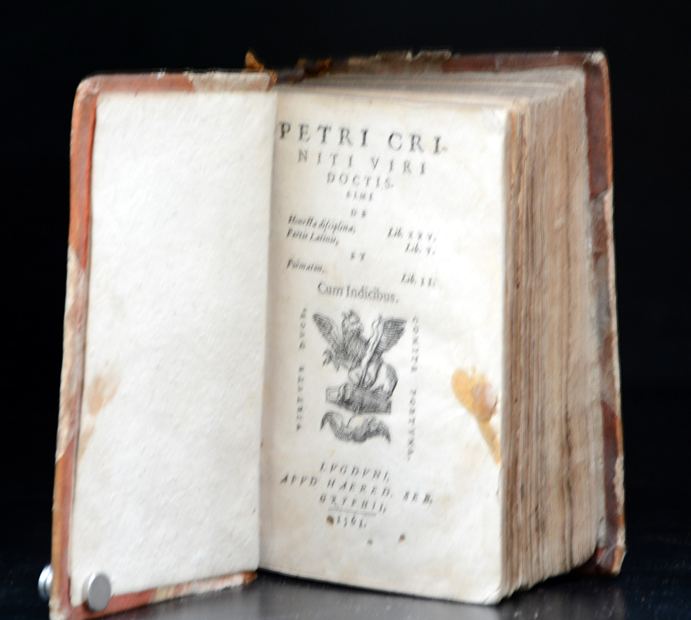 CRINITUS Petrus. De Honesta disciplina, Lib. XXV. Poetis Latinis, Lib. V. Et Poematon, lib. II. Cum Indicibus. Lione, Grifo, 1561. 12mo, numerose postille coeve e sottolineature, qualche difetto. Legatura del XVIII in mezza pelle, titolo su tassello al dorso (difetti). Non collazionato e difetti da esaminare.