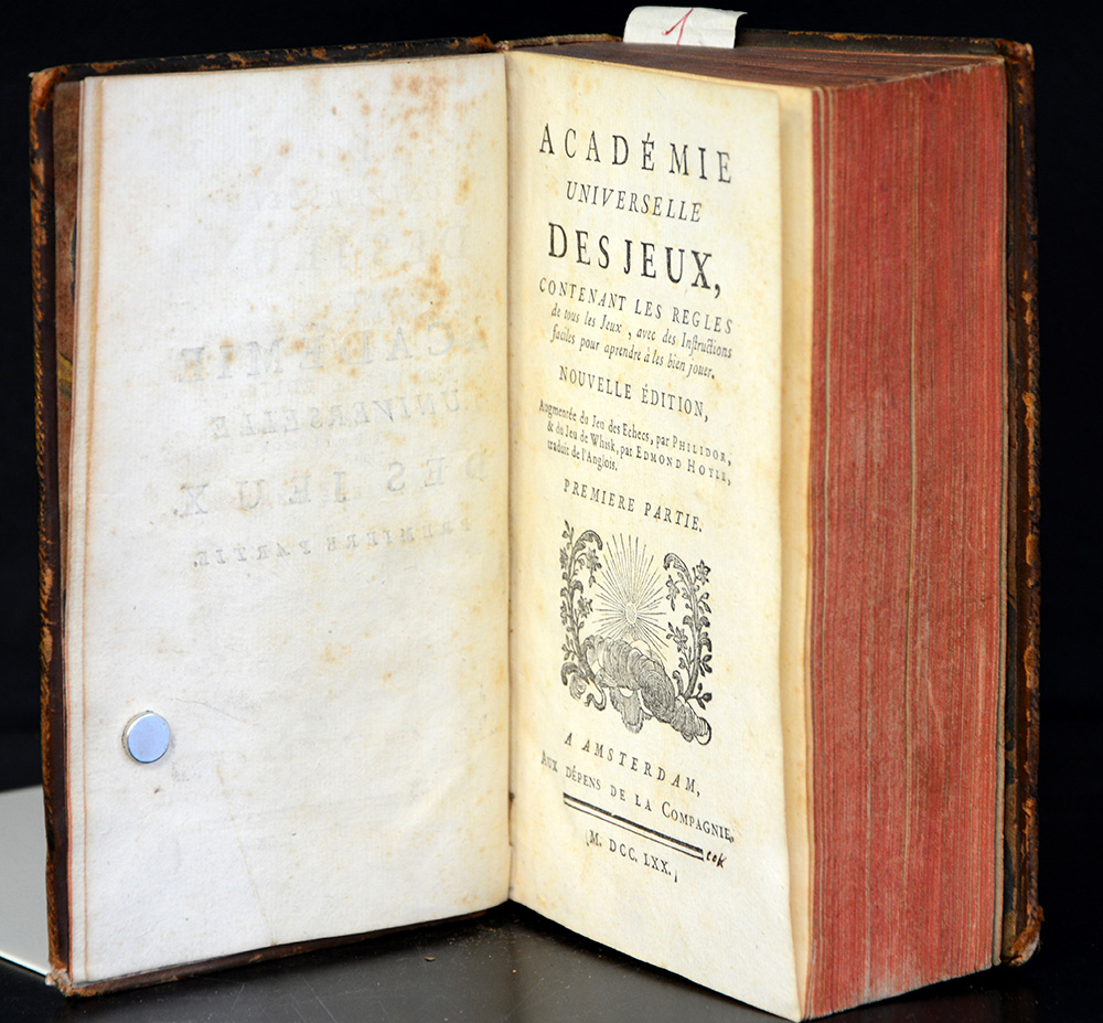 [GIOCHI] Academie universelle des jeux. Amsterdam: aux depens de la compagnie, 1770. 2 parti in un volume, 8vo in pelle coeva marmorizzata, tagli rossi (lievi difetti). Non collazionato e difetti da esaminare.