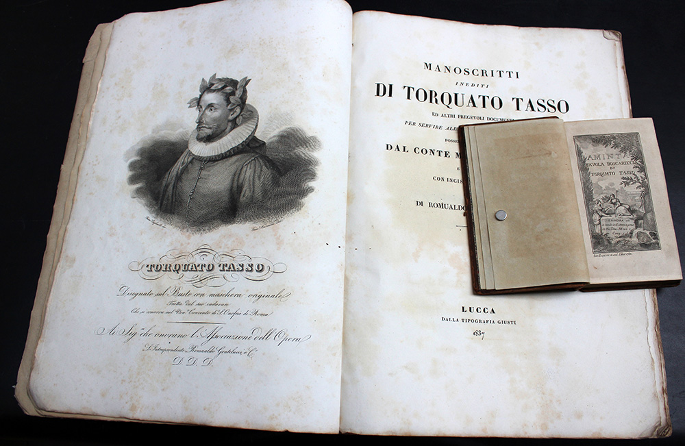 ALBERTI,M. Manoscritti inediti di Torquato Tasso ed altri pregevoli documenti. Lucca: 1837. Folio, cartone editoriale (difetti in particolare alla legatura). Insieme a Tasso, Aminta, Londra 1780. Non collazionato e difetti da esaminare.