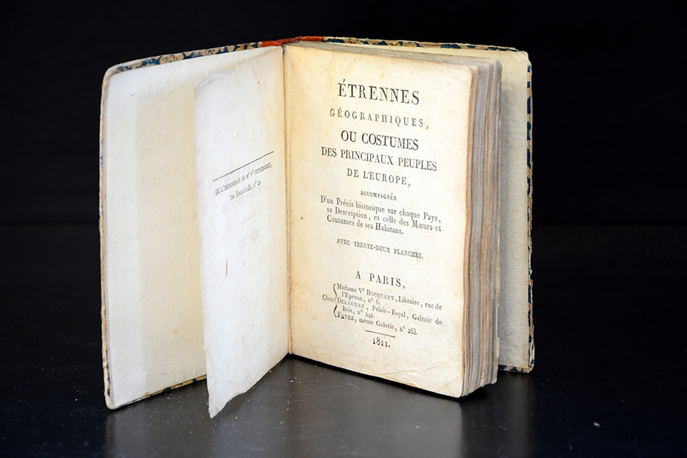 Etrenne geographique ou costumes des principaux peuples de l'Europe. Parigi: Hocquart, Delaunay, Favre, 1811. 12mo con 32 incisioni colorate a mano. In cartone d'epoca decorato a motivi floreali con dorso in pelle rossa. Non collazionato e difetti da esaminare.