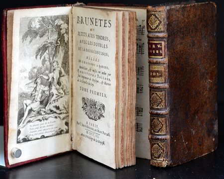 BALLARD, C., Brunetes ou Petits Airs tendres. Parigi, Jean de Beauvais, 1703. 12mo, 1 voll (di 2), antiporta xilografica e numerosi spartiti musicali nel testo. Legatura coeva in piena pelle con titolo e fregi dorati al dorso. Importante opera che raccoglie più di un centinaio di canzoni francesi del XVII secolo , purtroppo priva del secondo volume. Al lotto SI AGGIUNGE l'edizione ampliata stampata nello stesso anno e dal medesimo editore in legatura posteriore. Non collazionato e difetti da esaminare.