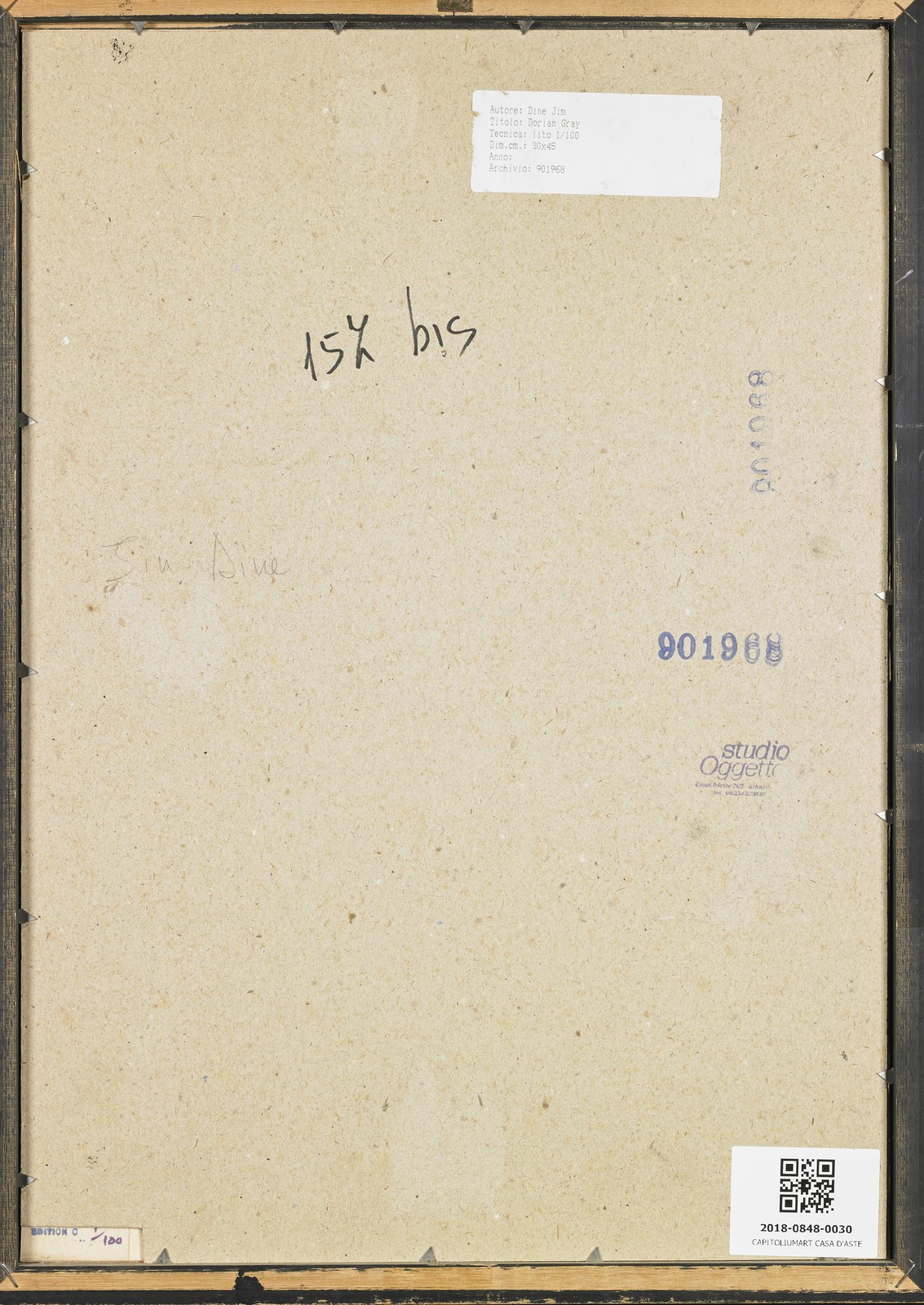 DINE JIM (n. 1935) The picture of Dorian Gray. Litografia. Cm 34,00 x 47,00. 1/100. Firma a matita in basso a destra. Al retro tiratura e timbro Studio Oggetto, Caserta. Cornice presente