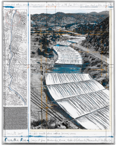 CHRISTO E JEANNE-CLAUDE N. 1935 E 1935-2009 OVER THE RIVER, PROJECT FOR THE ARKANSAS RIVER, STATE OF COLORADO signed, titled and dated 2005, signed and dated 2005 on the reverse, pencil, enamel, picture by Wolfgang Volz, pastels, fabric sample, map on panel firmato, intitolato e datato 2005; firmato e datato 2005 sul retro matita, smalto, fotografia di Wolfgang Volz, pastelli a cera, campione di tessuto, nastro adesivo e mappa topografica su tavola cm 36x28,5 L'opera è accompagnata da certificato su fotografia rilasciato dall'artista nel 2007 PROVENANCE Galleria Orler, Favaro Veneto Ivi acquistato dall'attuale proprietario