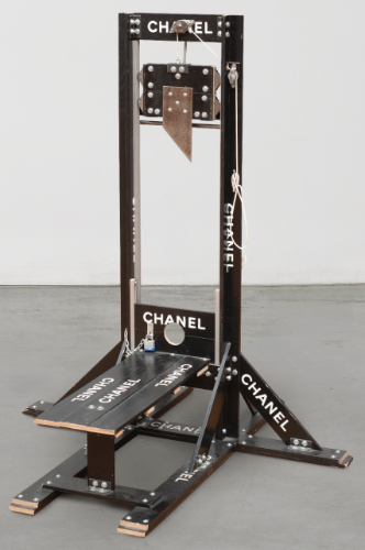 TOM SACHS N. 1966 CHANEL GUILLOTINE signed, numbered 1/3 and dated 2000 under the base, painted wood, chains, screw, bolts, rope and metal construction firmato, numerato 1/3 e datato 2000 sotto la base legno dipinto, catene, viti, bulloni, corda e costruzione metallica cm 125x106x103,5 Eseguito nel 2000 in una edizione di 3 esemplari PROVENANCE Galleria Cardi, Milano