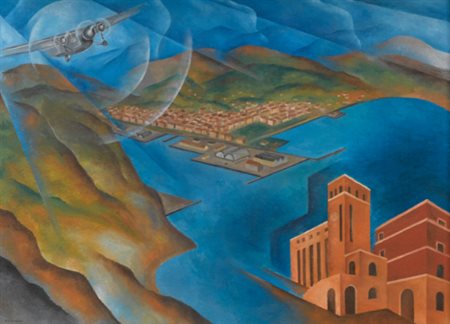 ALFREDO AMBROSI 1901-1945 ALLEGORIA DEL GOLFO E DEL PALAZZO DELLE POSTE DI LA SPEZIA signed, oil on canvas. Executed in 1933 circa firmato olio su tela cm 73x100 Eseguito nel 1933 circa LITERATURE M. Scudiero, A. M. Ruta, Futurismo e Futuristi a Firenze, Firenze 2011, illustrato