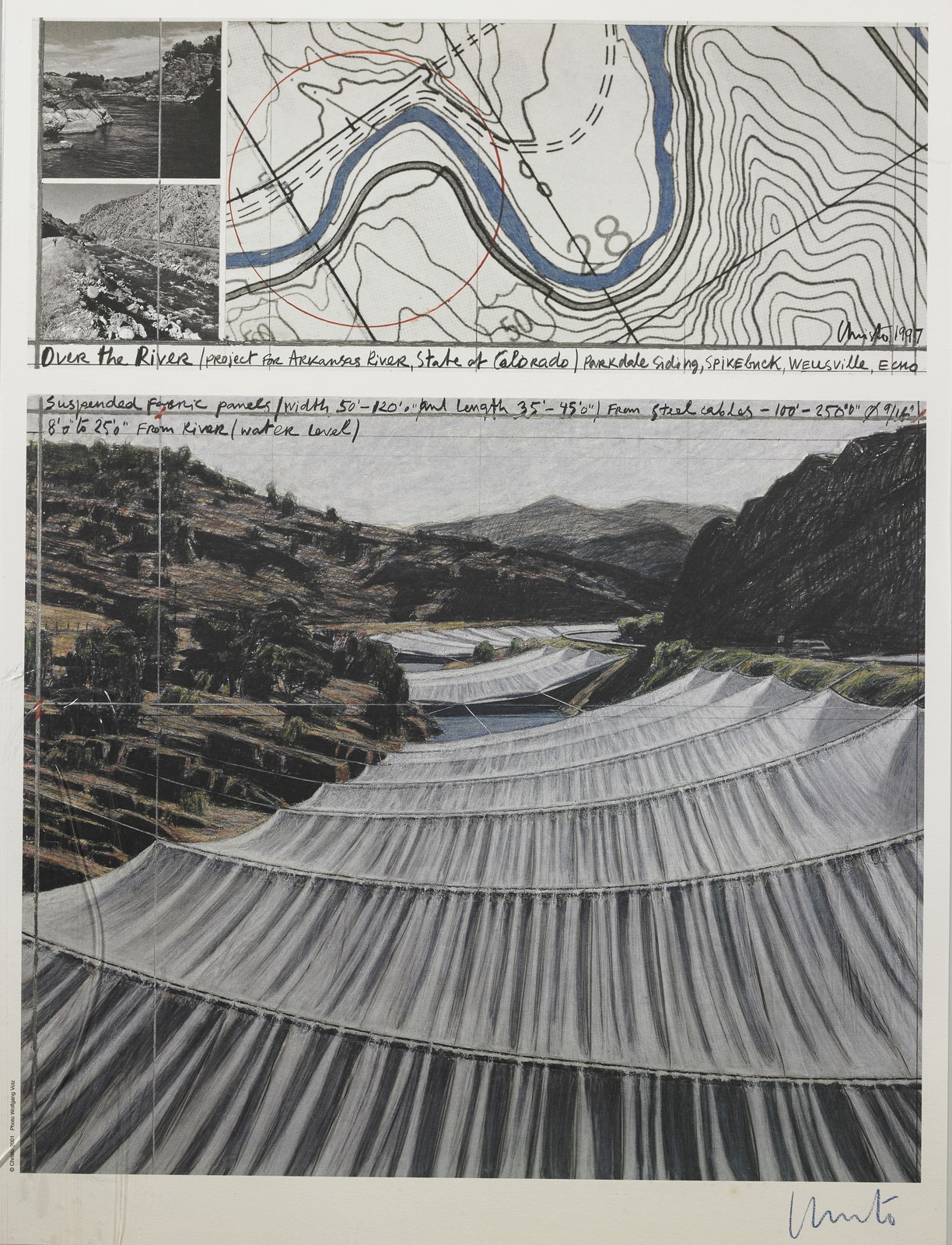 CHRISTO (n. 1935) Over the river. Project for Arkansas River. Poster. Cm 60,00 x 75,00. Signature and year upper right in print. Signature lower right in pencil. Cornice presente