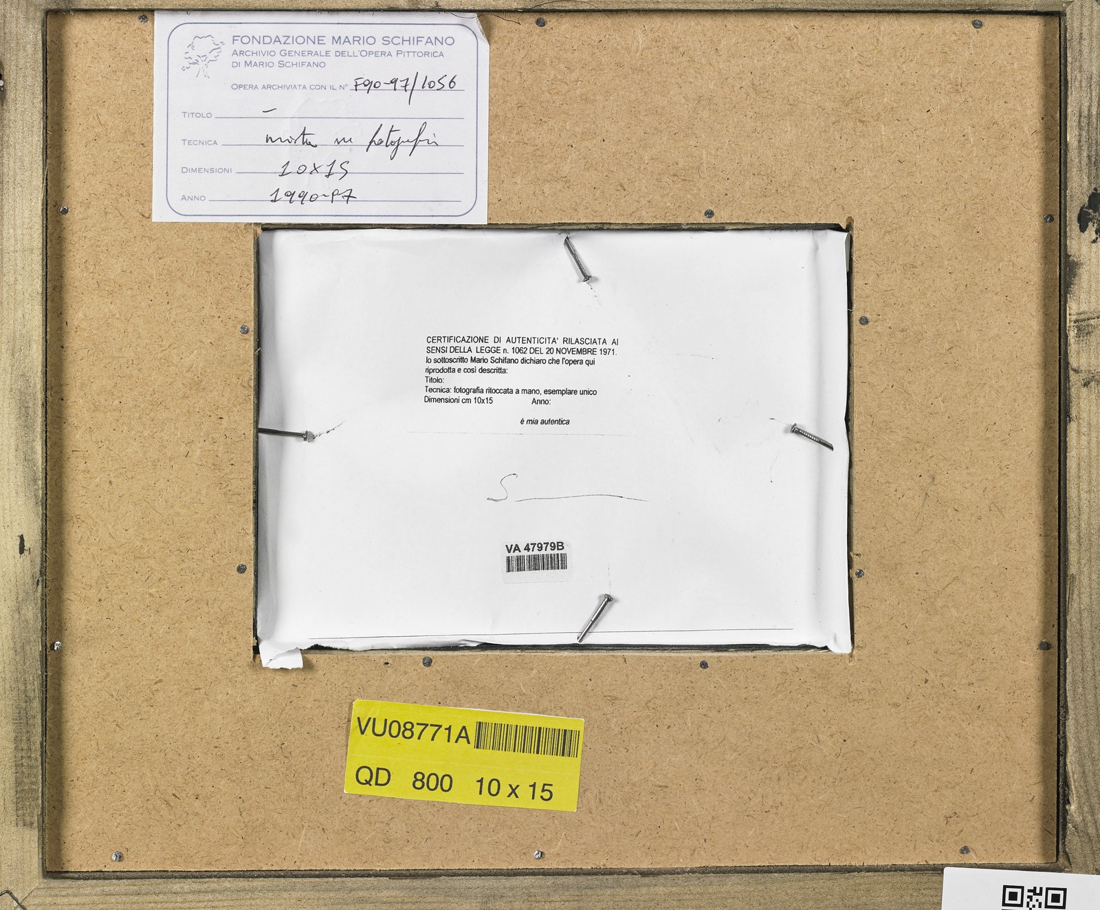 SCHIFANO MARIO (1934 - 1998) Senza titolo. Tecnica mista su fotografia. Cm 15,00 x 10,00. Timbro a secco Schifano in basso a destra. Al retro firma e cartiglio descrittivo Fondazione Multistudio Mario Schifano. Opera archiviata presso la Fondazione Mario Schifano Multistudio in data 10 Ottobre 2007, come da documentazione fotografica allegata all'opera riportante il relativo numero d'inventario. Certificato di autenticità Telemarket, Roncadelle (Bs). 1990-1997. Cornice presente