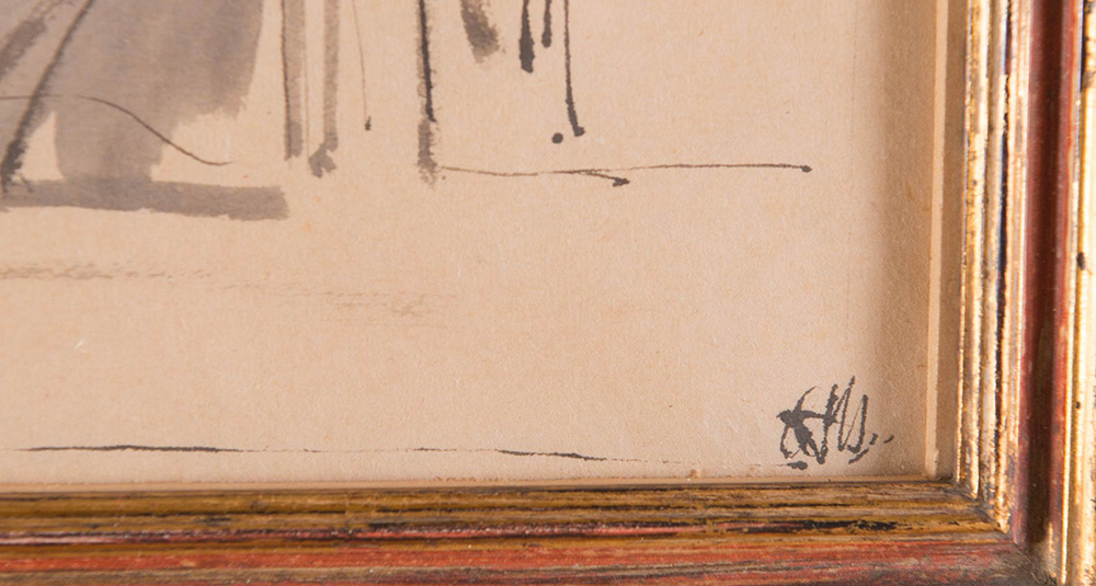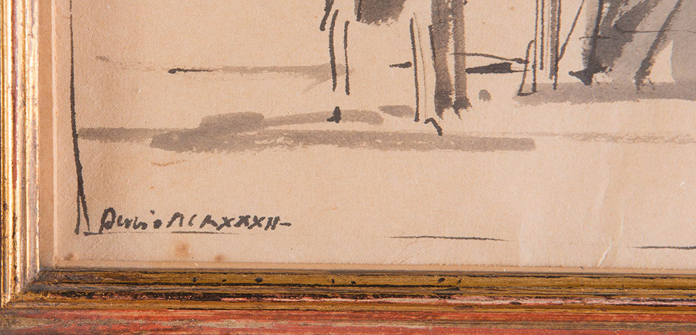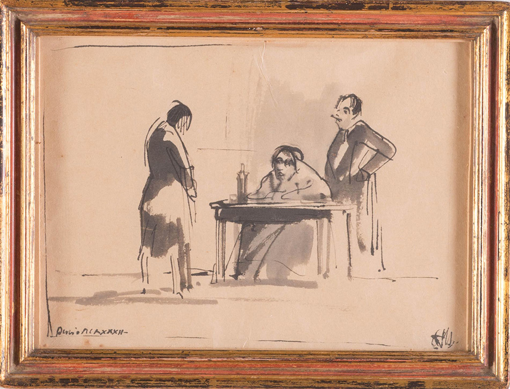 Pietro Annigoni (Milano 1910 - Firenze 1988), “Nello studio”. Tecnica mista su carta, siglata in basso a destra, in basso a sinistra iscrizione ‘Dervio.MCMXXXII’, H cm 19.5x28