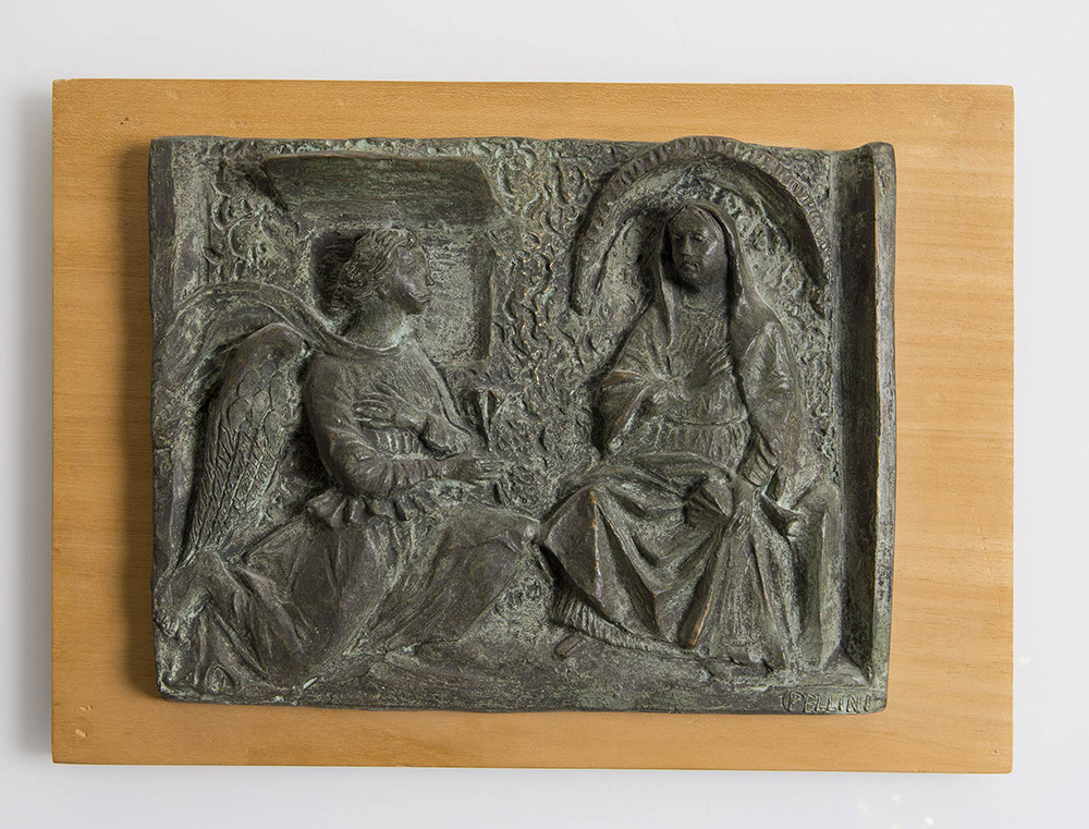 Eros Pellini (Marchirolo 1869 - Milano 1934), “Annunciazione”. Bassorilievo in bronzo, firmato in basso a destra Pellini, H cm 25.5x33x3