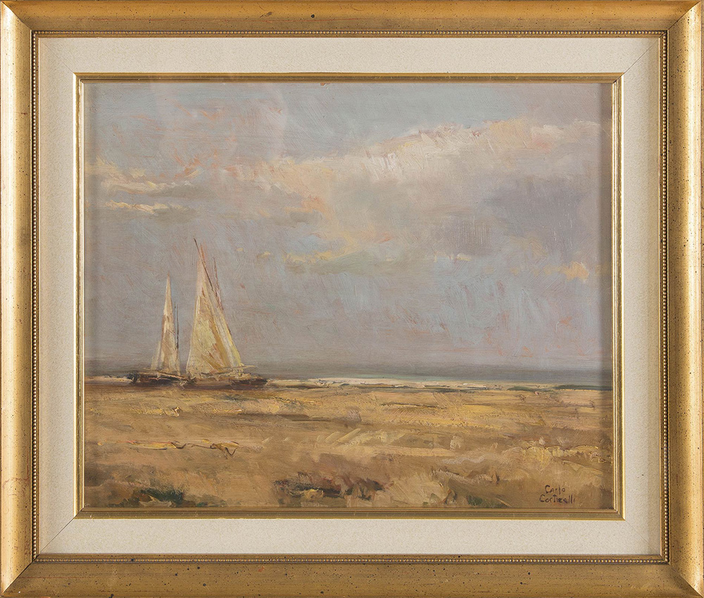Carlo Corticelli (XX sec.), “Marina”. Olio su tavola, firmato in basso a destra Carlo Corticelli, H cm 40x50