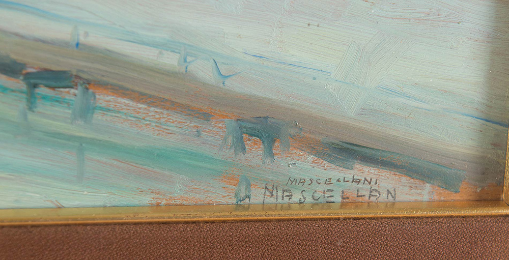 Norma Mascellani (Bologna 1909 - 2009), “Porto con barche”. Olio su tavola, reca doppia firma in basso a destra Mascellani, H cm 39.5x56.5