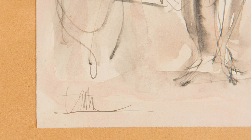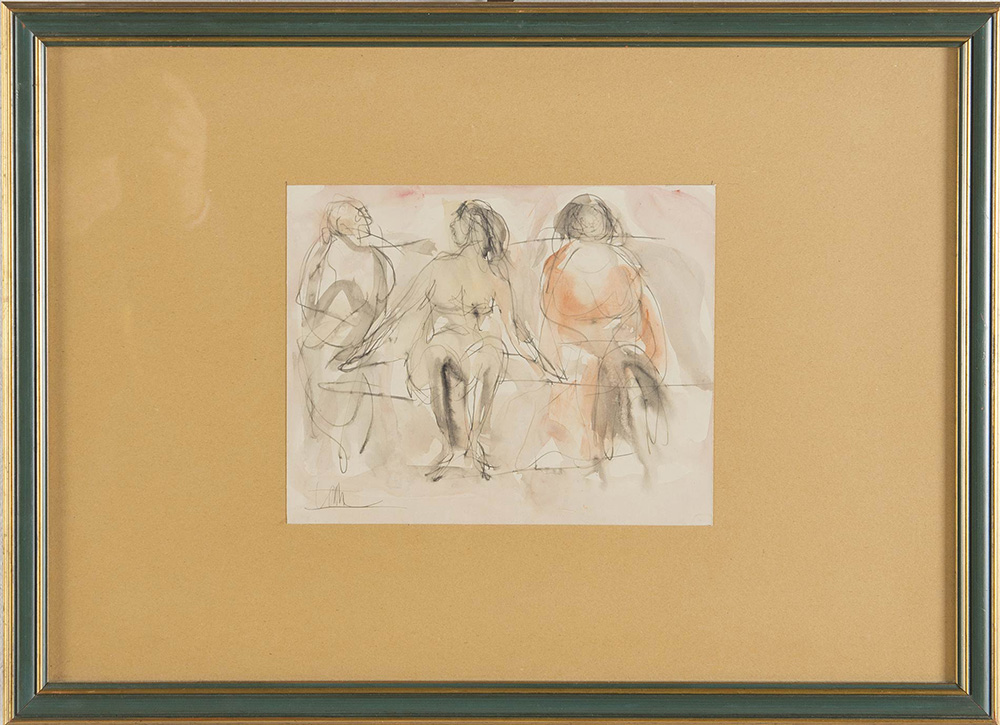 Cleto Tomba (Castel San Pietro Terme 1898 - Bologna 1987), “Tre figure sul divano”. Acquerello su carta, firmato in basso a sinistra Tomba, H cm 18x23