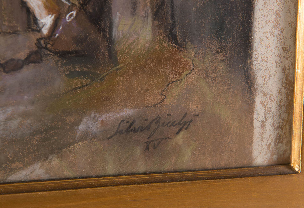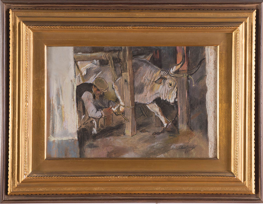 Silvio Bicchi (Livorno 1874 - Firenze 1948), “Nella stalla”, 1915. Tecnica mista su carta, firmato in basso a destra Silvio Bicchi XV, H cm 27.5x21