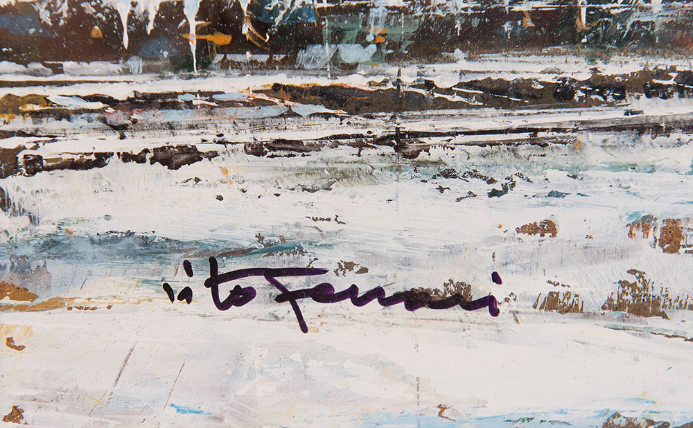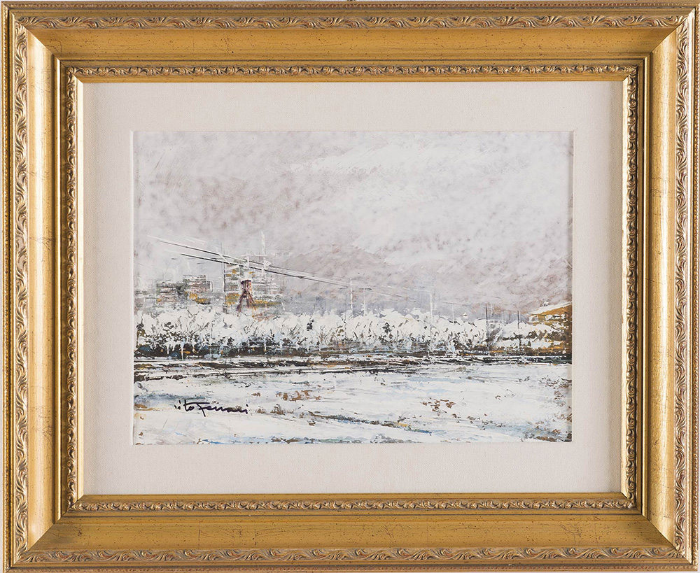 Vito Ferrari (Rovigo 1928), “Neve in periferia”, 2000. Olio su cartone, opera firmata in basso a sinistra Vito Ferrari, al retro reca firma, titolo e data ‘Vito Ferrari - 2000 - Neve in periferia’ H cm 30x40