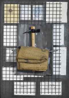 Jannis Kounellis (N. 1936) Senza titolo piombo, martello, sacco di juta, cavo d'acciaio, rete metallica e disegni su lamiera in ferro cm 100,3x70x13,5 Eseguito nel 2002 Autentica di M. Coudray su fotografia in data 16 dicembre 2002 Provenance Volos Arte Moderna, Roma ivi acquisito dall'attuale proprietario nel 2004