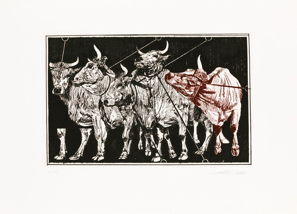 VALERIANO TRUBBIANI (1937)T'amo pio boveAcquaforteLastra cm 31,8x49,5Foglio...