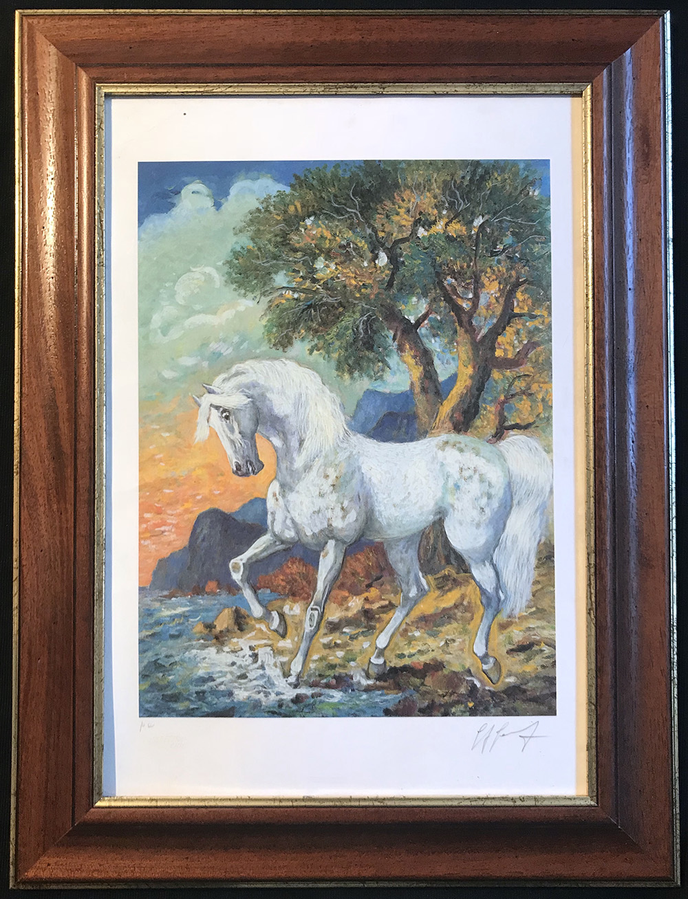 GONZAGA GIOVAN FRANCESCO Milano 1901 - Milano 2007 Cala San Vincente e cavallo bianco Serigrafia a 15 colori su carta 50x35 Firma in basso a destra e tiratura Pa a sinistra Certificato di garanzia di Prospettive d'arte srl (MI) al retro