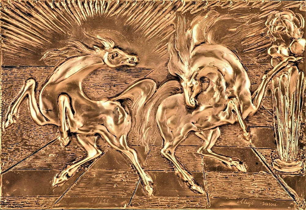 SASSU ALIGI Milano 1912 - Pollença 2000 Cavalli del sole bassorilievo in bronzo 30x20 firma in basso a destra, esemplare n. 90/299