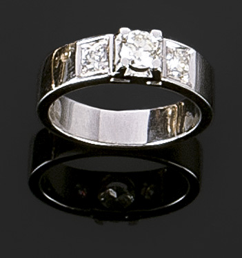 ANELLO Anello in oro bianco con al centro diamante taglio brillante rotondo di ct 0,48 ed ai lati due diamanti taglio brillante rotondo per complessivi ct 0,27 Peso gr. 8,68 Misura 18 Certificato di analisi R.A.G. n. D041mn/11N rilasciato in data 7/07/2011