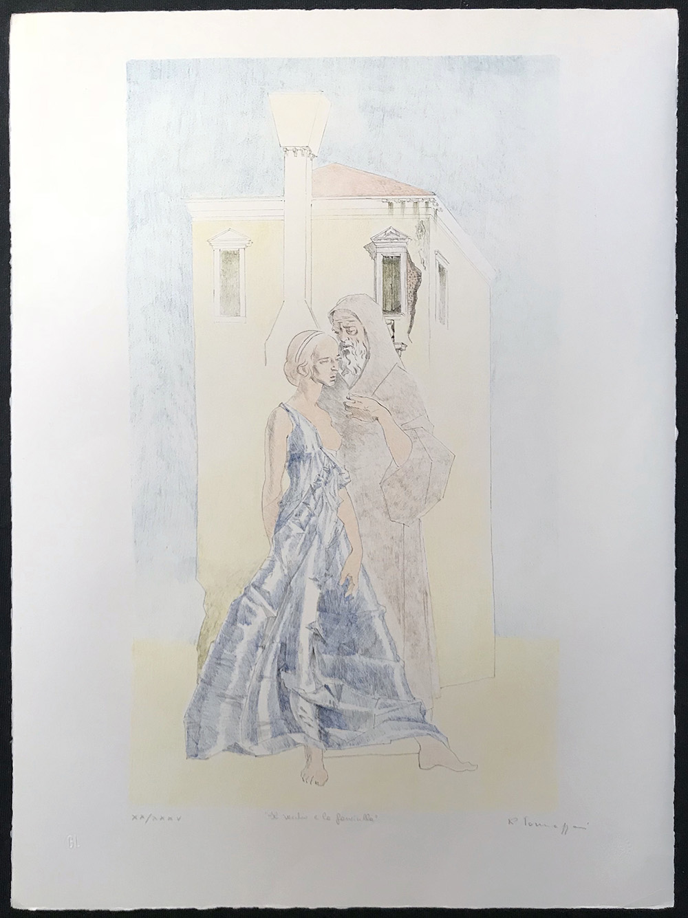 PARMEGGIANI ROMANO Il vecchio e la fanciulla litografia 80x60 Firma, titolo e tiratura XX/XXXV in basso