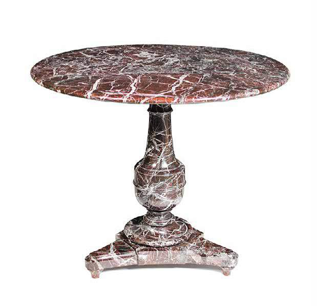 TAVOLO IN MARMO ROSSO INIZI DEL XIX SECOLO con piano circolare sorretto da un montante centrale a balaustro poggiante su una base trilobata, cm 80x97. Provenienza: Roma, Finarte, asta 901, 01/06/1994, lotto n. 254