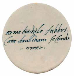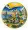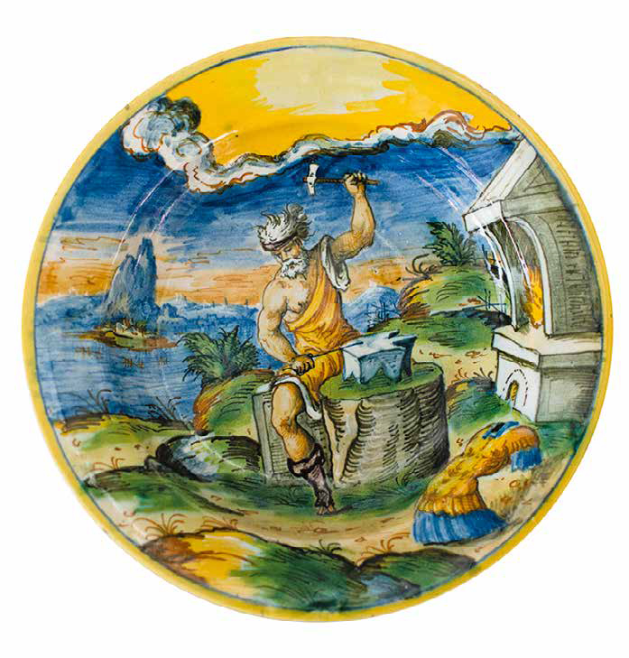 PIATTO IN MAIOLICA POLICROMA BOTTEGA DI MASTRO DOMENICO, VENEZIA, 1560 CIRCA Il piatto è a piccola tesa e ampio cavetto integralmente dipinto e smaltato. Il verso di color avorio con tracce di verde e fasce circolari concentriche gialle, con piede ad anello, è iscritto: Arme di Achille fabbricate da Ullchano secondo Omero, diametro cm 25