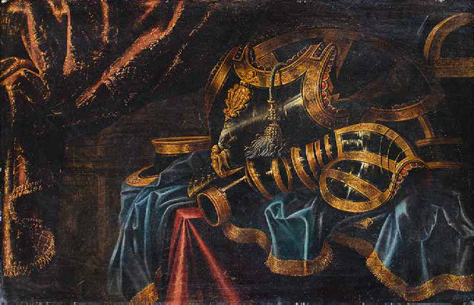 MADELEINE BOULOGNE (ATTRIBUITO) Parigi 1646 – 1710 NATURA MORTA CON ARMATURA E TENDAGGI olio su tela, cm 69x97. Provenienza: Venezia, Semenzato, 26/04/1992, lotto n. 84
