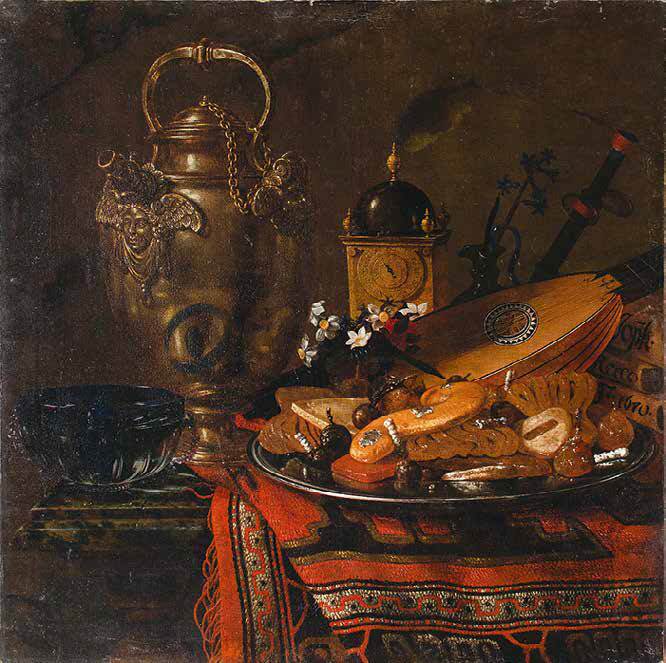 GIUSEPPE RECCO Napoli 1634 – Alicante 1695 NATURA MORTA CON DOLCI, OROLOGIO E MANDOLINO, “I SENSI”, 1670 olio su tela, cm 77x80. Firmato e datato a destra in corrispondenza dei libri: Joph. Recco F. 1670. Provenienza: Vignola (Mo), Gruppo Tessile Nadini S.p.A.; Bologna, Porro & C., Dipinti antichi, Mobili e Oggetti d’arte dal Fallimento del Gruppo Nadini S.p.A., 15/11/2003, lotto n. 236; Opera notificata ai sensi del DLgs. 42/2004
