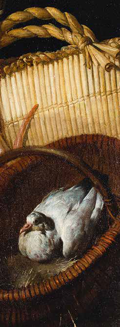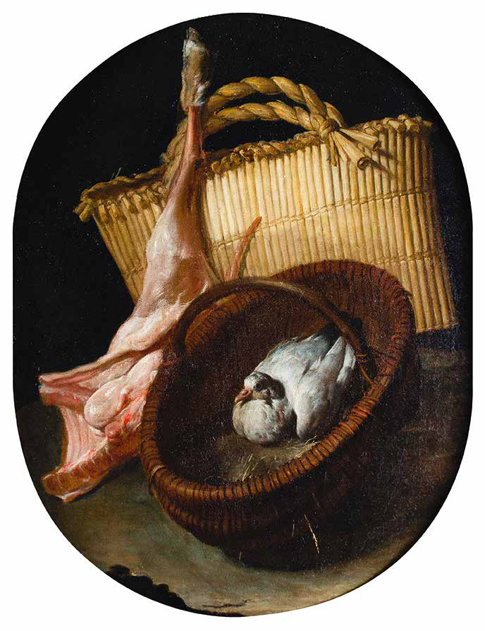 ARCANGELO RESANI Roma 1670 – Ravenna 1740 NATURA MORTA CON CESTO CON COLOMBA, QUARTO DI CAPRETTO E SPORTA olio su tela, cm 64,5x49. Provenienza: Parigi, Collezione Vitale Bloch; Francia, Collezione privata; New York, Bob Haboldt; New York, Christie’s, 7 giugno 2002, lotto 46; Collezione privata; Esposizioni: Napoli, Zurigo, Rotterdam, La Natura Morta italiana, 1964/65, n. 285 (etichetta al verso); Bibliografia: R. Roli in La Natura Morta italiana, catalogo della mostra, Milano 1964, pp. 119-120; S. Bottari, La nature morte italienne, in “L’Oeil”, 1964, p. 7; M. Rosci, La natura morta, in Storia dell’Arte Italiana, XI, Torino 1982, p. 173; L. Salerno, La natura morta italiana, Roma 1984, pp. 360-361; A. Colombi Ferretti in F. Zeri (a cura di), La Natura Morta in Italia, Milano 1989, p. 490; A. Cecchi in Autoritratti dagli Uffizi da Andrea Del Sarto a Chagall, catalogo della mostra, Firenze 1990, n. 24; F. Baldassari in D. Benati, L. Peruzzi (a cura di), La natura morta in Emilia e in Romagna, Milano 2000, pp. 272-274; N. Roio in L’anima e le cose. La natura morta nell’Italia pontificia nel XVII e XVIII secolo, catalogo della mostra, Fano 2001, p. 139.