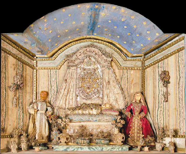 SCUOLA DELL’ITALIA MERIDIONALE, INIZI DEL XVIII SECOLO SAN GIOACCHINO E SANT’ANNA CON MARIA BAMBINA cera, filigrana, argento dorato, pietre, legno, dimensioni cm 79x88x25. Esposizioni: Galeata, C’era una volta, Composizioni devozionali in cera dal XVII al XIX secolo, Museo Civico “Mons. Domenico Mambrini” di Pianetto, 3 settembre - 6 novembre 2016