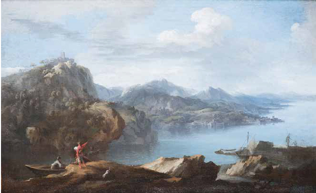 PANDOLFO RESCHI Danzica 1643 – Firenze 1699 PAESAGGIO olio su tela applicata su tavola, cm 45x71. Inscritto al retro: Reschi. Si ringrazia la Dottoressa Francesca Baldassari per l’assistenza alla schedatura dell’opera