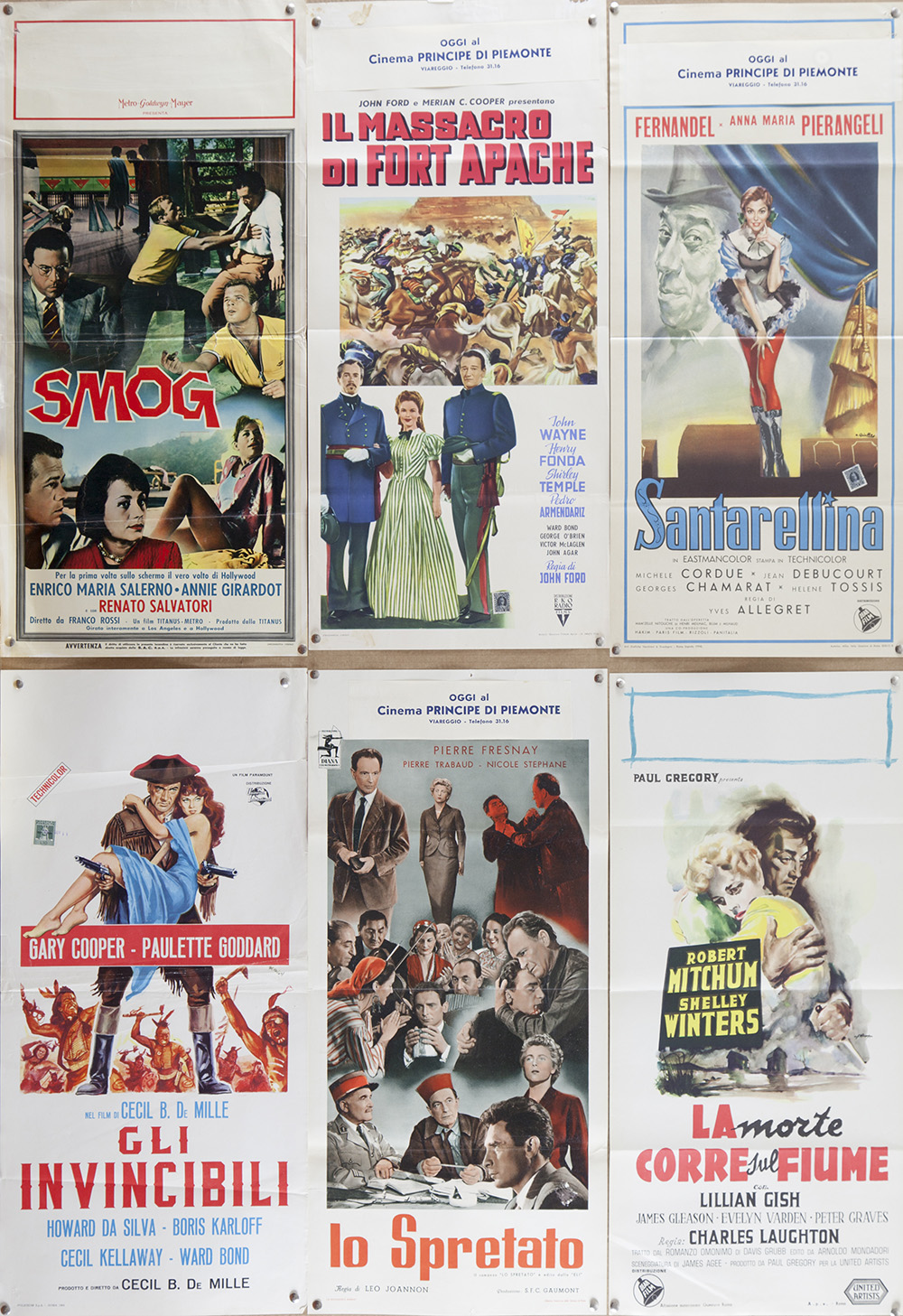 IL MASSACRO DI FORT APACHE (1948) + ALTRI Lotto unico di n. 6 locandine, cm 70x33, attori principali: John Wayne, Ava Gardner e Robert Mitchum Condizioni: DA SUFFICIENTE A OTTIMO