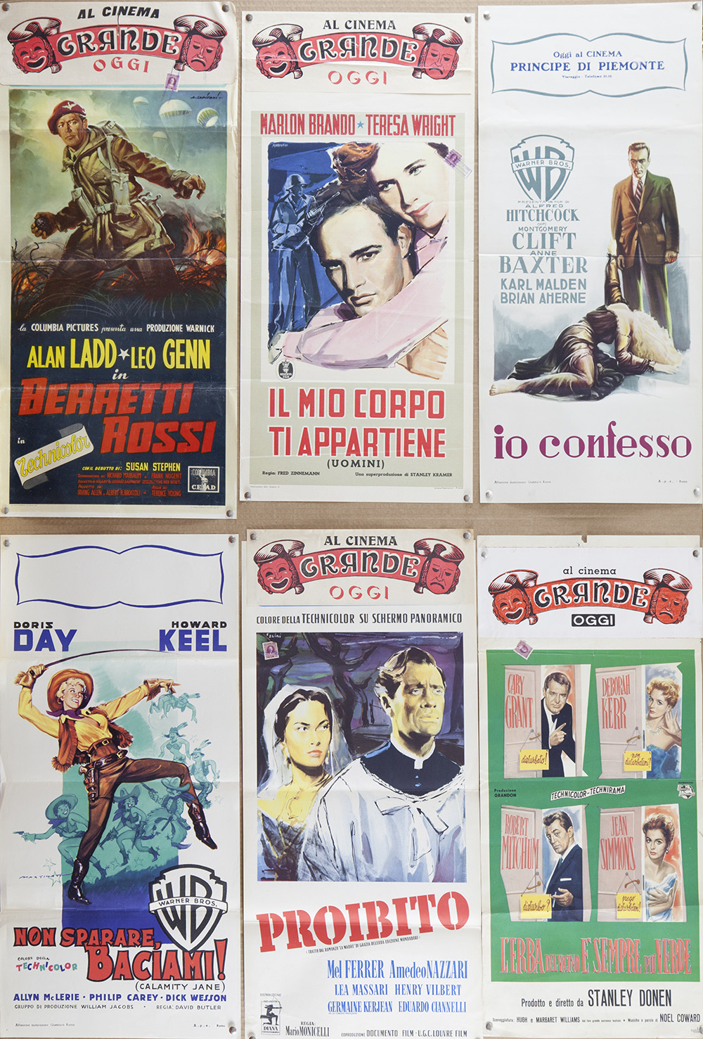 IL MIO CORPO TI APPARTIENE (1950) + BERRETTI ROSSI + ALTRI Lotto unico di n. 6 locandine, cm 70x33, attori principali: Marlon Brando e Alan Ladd Condizioni: DA SUFFICIENE A BUONO