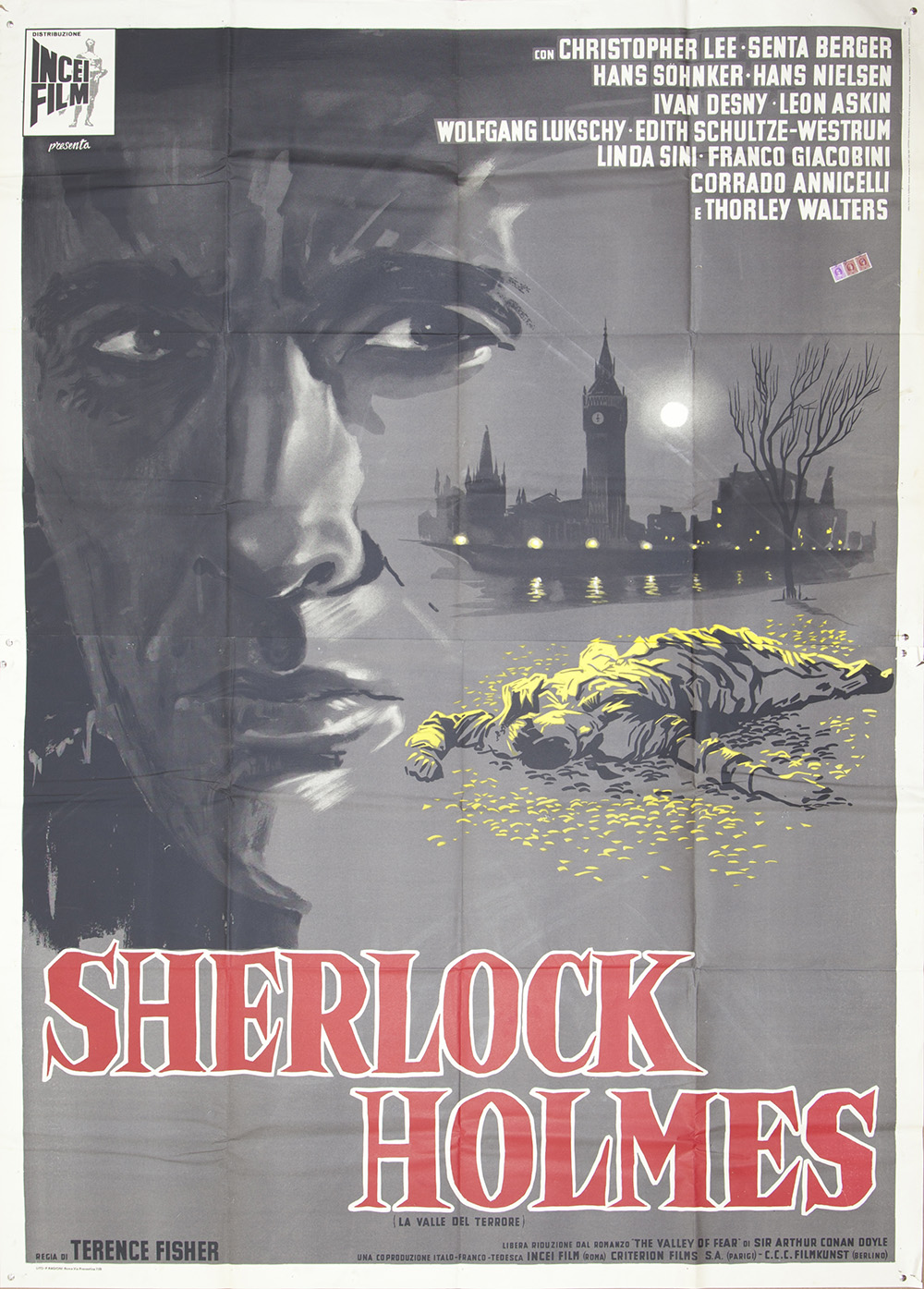 SHERLOCK HOLMES (La valle del terrore - 1962) Manifesto, cm 200x140 film con Christopher Lee firmato presenza di marca da bollo Condizioni: OTTIMO