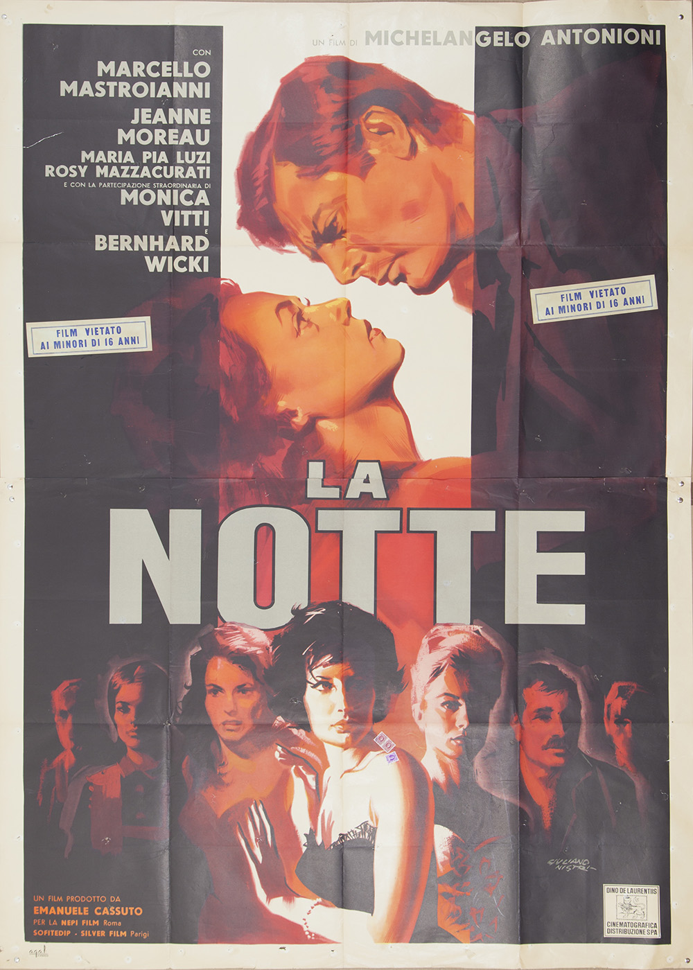 LA NOTTE (1961) Manifesto, cm 200x140 film con Marcello Mastroianni e Monica Vitti firmato presenza marca da bollo Condizioni: SUFFICIENTE