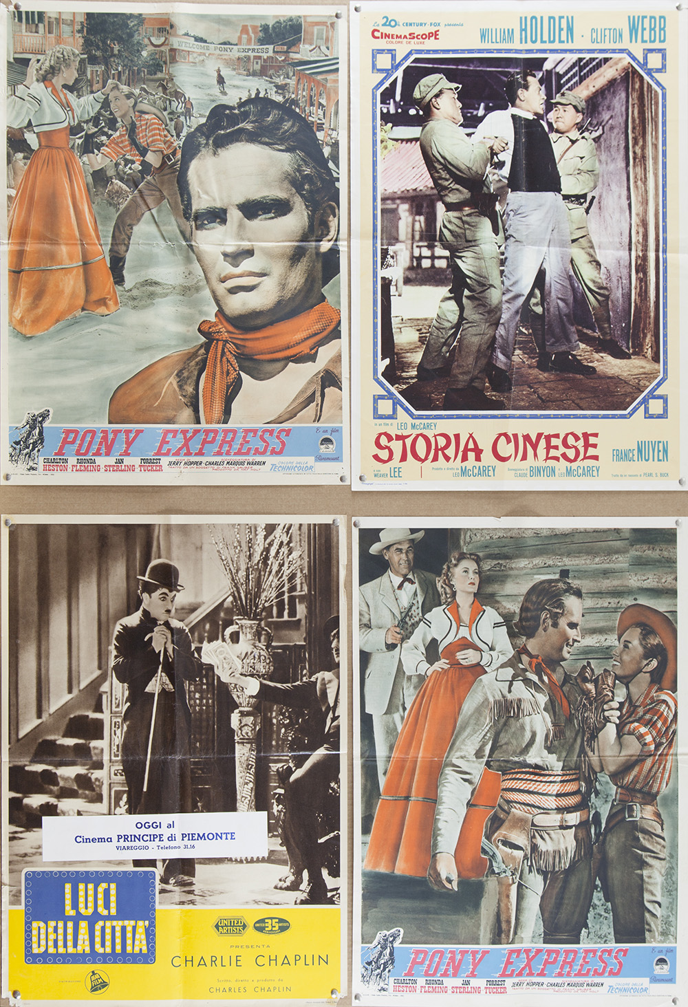 LUCI DELLA CITTÀ + ALTRI (anni '50 -'60) Lotto unico di n. 4 fotobuste, cm 70X50 film con Charlie Chaplin presenti alcune marche da bollo Condizioni: BUONO