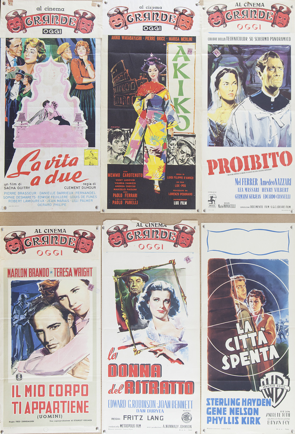 IL MIO CORPO TI APPARTIENE + ALTRI (anni '50) Lotto unico di n. 6 locandine, cm 70x33 film con Marlon Brando alcune firmate presenza di marca da bollo Condizioni: BUONO