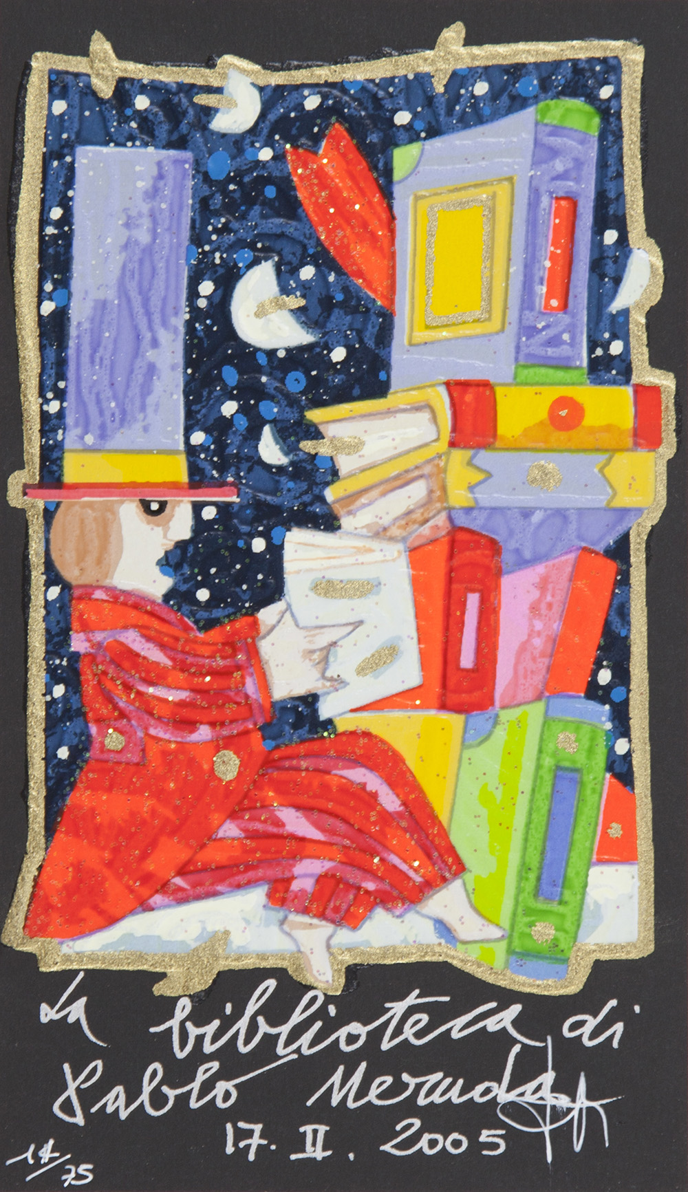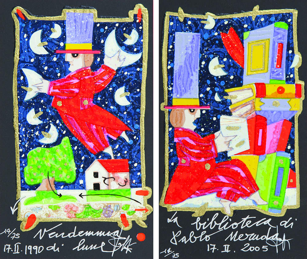 Francesco Musante Genova 1950 Lotto unico di n. 2 serigrafie su carta: - "Vendemmia", esemplare n. 14/75, cm 17x10 - "La biblioteca di Pablo Neruda", esemplare n. 14/75, cm 17x10 firmate in basso a destra; numerate in basso a sinistra