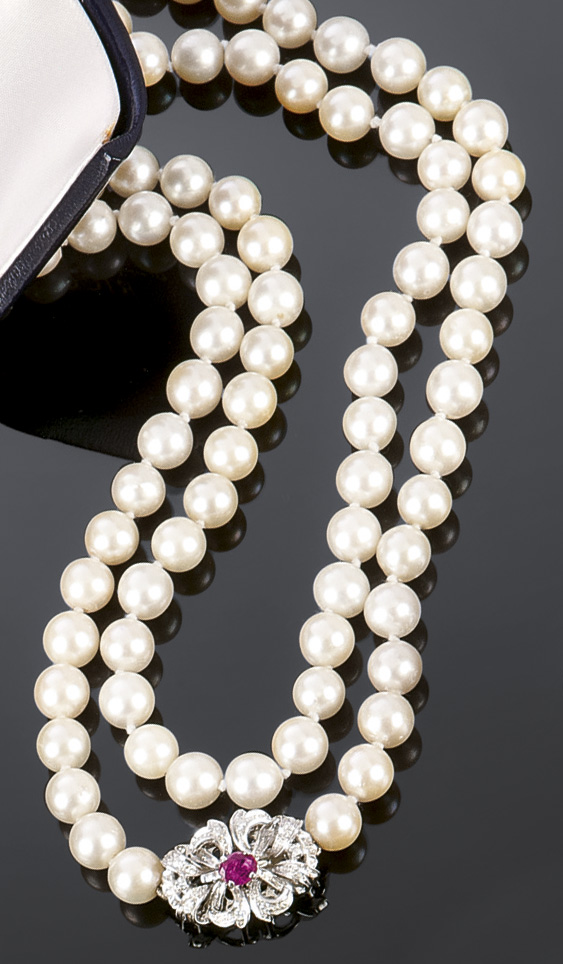 COLLANA DI PERLE Collana composta da perle del diam da mm 8,00 a 8,2 con fermaglio in oro bianco con al centro rubino di taglio ovale e diamantini taglio brillante rotondo