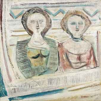 Massimo Campigli (1895-1971) Due figure firmato e datato Campigli 65 (in basso a destra) olio su tela cm 78x78 Eseguito nel 1965 Autentica su fotografia dell'Archivio Campigli a cura di Nicola Campigli, Saint Tropez, n. 860625321, in data 25 giugno 1986 Provenance Brerarte, Milano ivi acquisito dall'attuale proprietario nel 1987